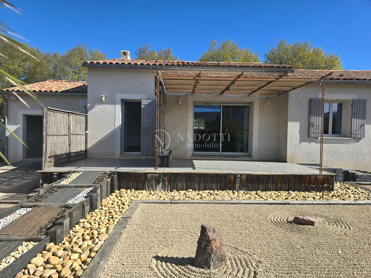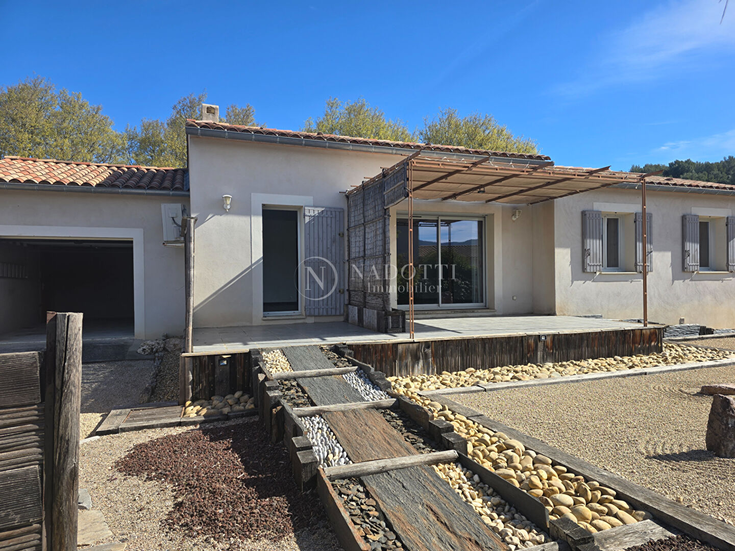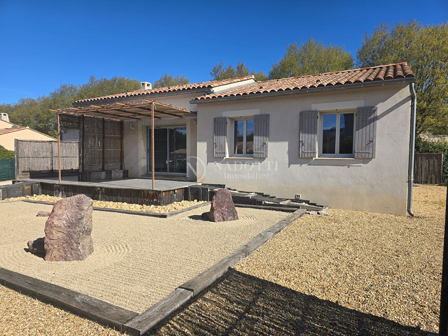 L'agence immobilière NADOTTI située dans le Luberon vous propose à la vente, cette charmante maison de plain-pied située au centre du village, cette maison d'environ 110 m², construite en 2012 , vous séduira par ses prestations de qualité et son excellent état . Elle offre une vaste et lumineuse pièce de vie ouverte sur la cuisine, complétée par une buanderie . Côté nuit, vous disposerez de trois chambres d'un dressing, d'une salle d'eau douche à l'italienne moderne avec double vasque, et WC, ainsi qu'un WC indépendant. Un garage d''environ 25 m² avec porte motorisée vient compléter l'ensemble, ainsi qu'une agréable terrasse équipée d'une toile pour profiter des beaux jours. Implantée sur un terrain d'environ 800 m² entièrement clôturée, la maison bénéficie d'un magnifique jardin paysagé à la japonaise, propice à la détente . Construite sur vide sanitaire, la maison est reliée au tout-à-l'égout et à l'eau de ville, avec possibilité de raccordement à la fibre. Le chauffage est assuré par une climatisation réversible dans le séjour et des radiateurs électriques dans les chambres. A seulement 5Km de Gordes, 6Km de Coustellet et ses commerces, à environ 45 minutes de la gare TGV d'Avignon, 1H de l'aéroport Marseille -Provence. Honoraires charge acquéreur 5 % TTC, prix net vendeur 375 250 euros (5.26 % honoraires TTC à la charge de l'acquéreur.)