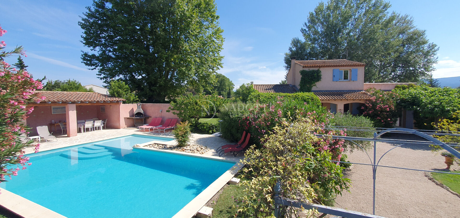 A vendre, sur la commune de l'Isle sur la Sorgue, l'agence NADOTTI Immobilier vous propose cette superbe villa individuelle de 5 belles pièces comprenant au RDC une cuisine équipée de 12 m², un salon de 30 m² , 2 chambres avec salle de bains, un wc, à l'étage 2 autres chambres, une salle d'eau et un wc. Vous trouverez également à l'extérieur un studio de 33 m² indépendant. Niché dans un cadre de verdure idyllique, cette maison vous propose également une belle piscine avec plage immergée, un coin avec jeu de pétanque, un espace jardin très soigné et entretenu. Aucun travaux n'est à prévoir. For sale, in Isle sur la Sorgue, the NADOTTI Immobilier agency offers you this superb detached villa with 5 beautiful rooms including on the ground floor a fitted kitchen of 12 sqm, a living room of 30 sqm, 2 bedrooms with bathroom, a toilet, upstairs 2 other bedrooms, a shower room and a toilet. You will also find outside an independent studio of 33 sqm. Nestled in an idyllic green setting, this house also offers you a beautiful swimming pool with a beach, a corner for a pétanque game, a very neat and maintained garden area. No work is required. You just have to put down your suitcases. 45 minutes from the TGV station, and 45 minutes from Marseille Provence airport. Vous avez juste à poser vos valises. A 45 mn de la gare TGV, et 45 mn de l'aéroport Marseille Provence.