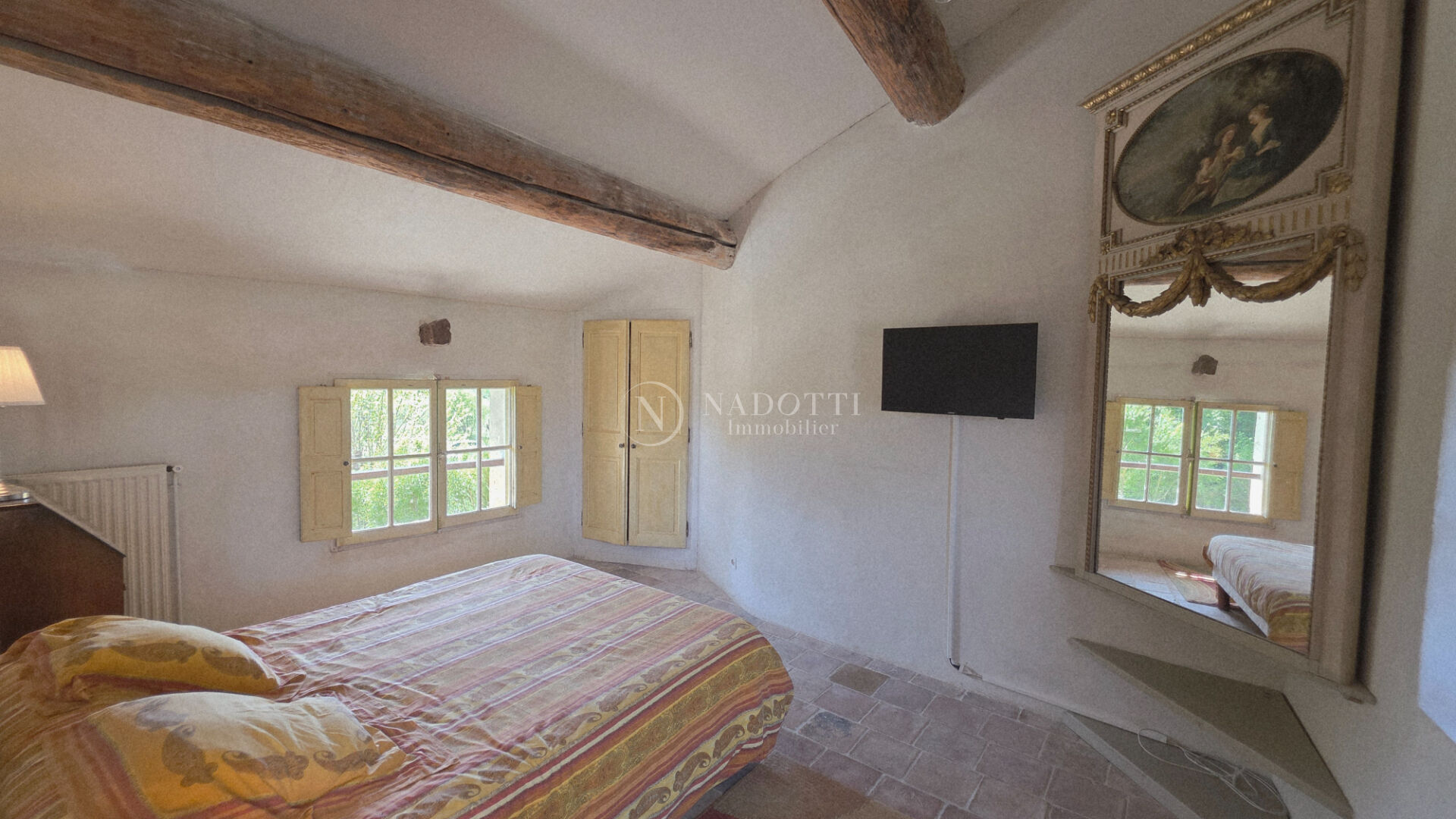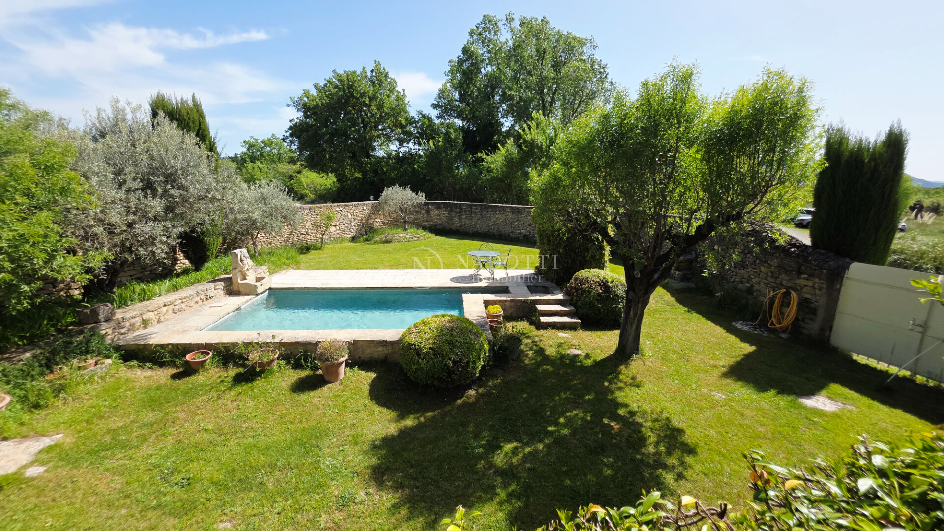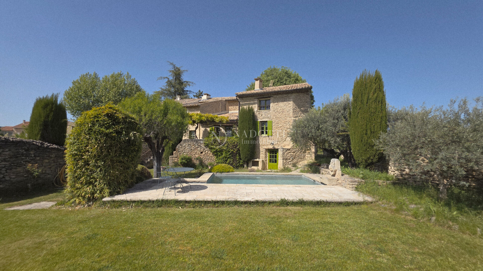 L'agence Nadotti vous propose à la vente cette magnifique propriété du XVIIIe siècle en pierre du pays, située en campagne non isolée de Gordes, dans un cadre idyllique avec vues imprenables sur le Luberon , les Dentelles de Montmirail et le Mont Ventoux. Ce mas de caractère se compose en rez-de-chausée : de deux grandes caves voutées dont une, aménagée en bureau, chauffée, une entrée, un espace pouvant faire office de chambre d'enfant et une chaufferie. Le premier étage accueille les pièces de vie : une entrée, un salon avec cheminée, une salle à manger ouvrant sur une agréable terrasse, une seconde salle à manger avec cheminée ainsi qu'une cuisine ouverte donnant sur une terrasse ombragée au nord, Une salle d'eau avec WC et une suite principale avec salle d'eau complète le niveau. Au deuxième étage, un espace bureau dessert une suite bénéficiant d'une belle terrasse tropézienne, ainsi qu'une chambre avec terrasse offrant une vue remarquable sur Gordes et son château. A l'extérieur, le charme opère immédiatement avec un jardin intimiste entièrement ceint de murets en pierre sèche. Vous profiterez d'un bassin-piscine exposé plein sud, ainsi que d'un espace de stationnement ombragé par un majestueux micocoulier au nord. Ce bien rare séduira les amateurs d'authenticité par son environnement paisible, son cachet et ses panoramas exceptionnels.