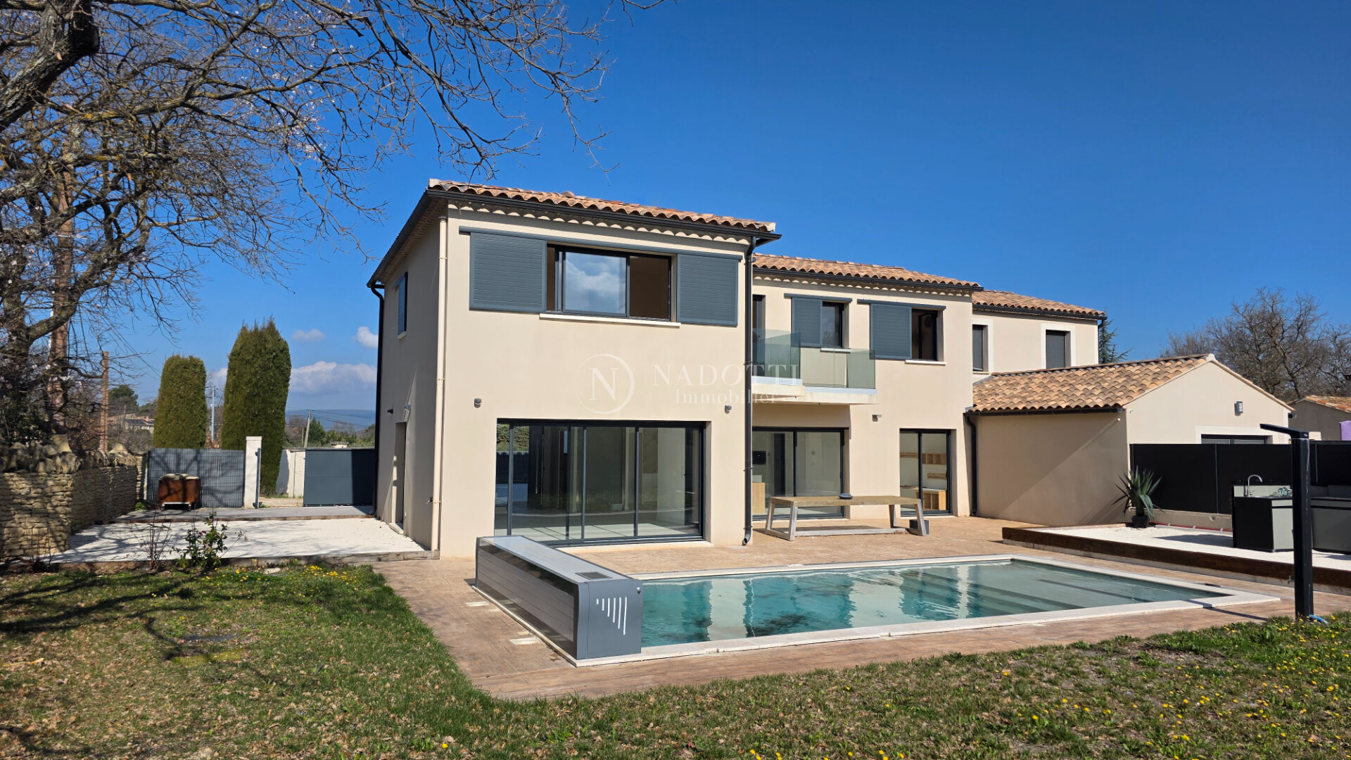 Au coeur du Luberon, sur la commune très prisée d'Oppède, découvrez cette maison récente de style contemporain, offrant des prestations de qualité et un cadre de vie exceptionnel face aux paysages emblématiques du massif du Luberon. Développant une surface habitable d'environ 160 m², cette propriété séduit dès l'entrée par son architecture moderne et ses lignes épurées. Le rez-de-chaussée accueille un vaste espace de vie, baigné de lumière naturelle grâce à de larges baies vitrées qui ouvrent généreusement sur l'extérieur. Salon, salle à manger et cuisine s'y conjuguent dans une atmosphère fluide et conviviale, idéale pour recevoir et profiter pleinement de la vue dégagée sur le Luberon. Les volumes, la luminosité et la qualité des finitions confèrent à cet espace un confort de vie rare. A l'étage, la maison propose trois chambres soigneusement agencées. Une suite parentale offre un espace intime et confortable, complété par sa salle d'eau privative et des rangements adaptés. Les deux autres chambres, lumineuses et bien proportionnées, se partagent une salle de bains, répondant parfaitement aux besoins d'une famille ou de résidences secondaires accueillant famille et amis. A l'extérieur, le terrain d'environ 710 m², entièrement clos de murs, garantit intimité et tranquillité. La piscine s'intègre harmonieusement dans l'ensemble et invite à la détente durant les belles journées provençales, tout en profitant d'un panorama exceptionnel sur le Luberon. Les espaces extérieurs ont été pensés pour prolonger naturellement les pièces de vie et offrir différents lieux de convivialité ou de repos. Cette maison contemporaine, récente et parfaitement intégrée à son environnement, conjugue élégance, modernité et douceur de vivre. Une opportunité rare à Oppède, pour les amateurs de biens d'exception au coeur de la Provence.